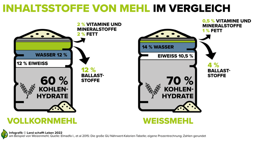 Einen Vergleich der Inhaltsstoffe von Vollkorn und Weißmehl findet ihr an vielen Stellen. Hier einmal eine Infografik von Land schafft Leben. Ich denke die Zahlen sprechen für sich.
