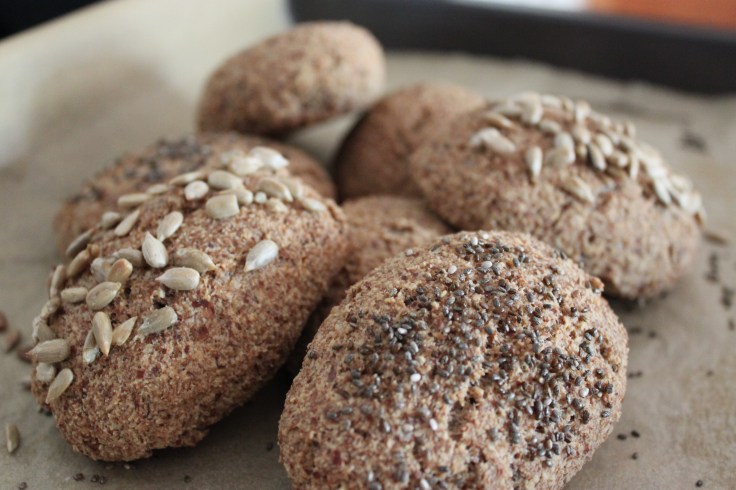 Ich habe die Brötchen bisher immer mit nicht-blanchierten, gemahlenen Mandeln sowie mit nicht-gemahlenen Flohsamenschalen zubereitet. Aber wer das Ganze weniger rustikal haben möchte, nutzt vielleicht besser blanchierte Mandeln sowie gemahlene Flohsamenschalen.